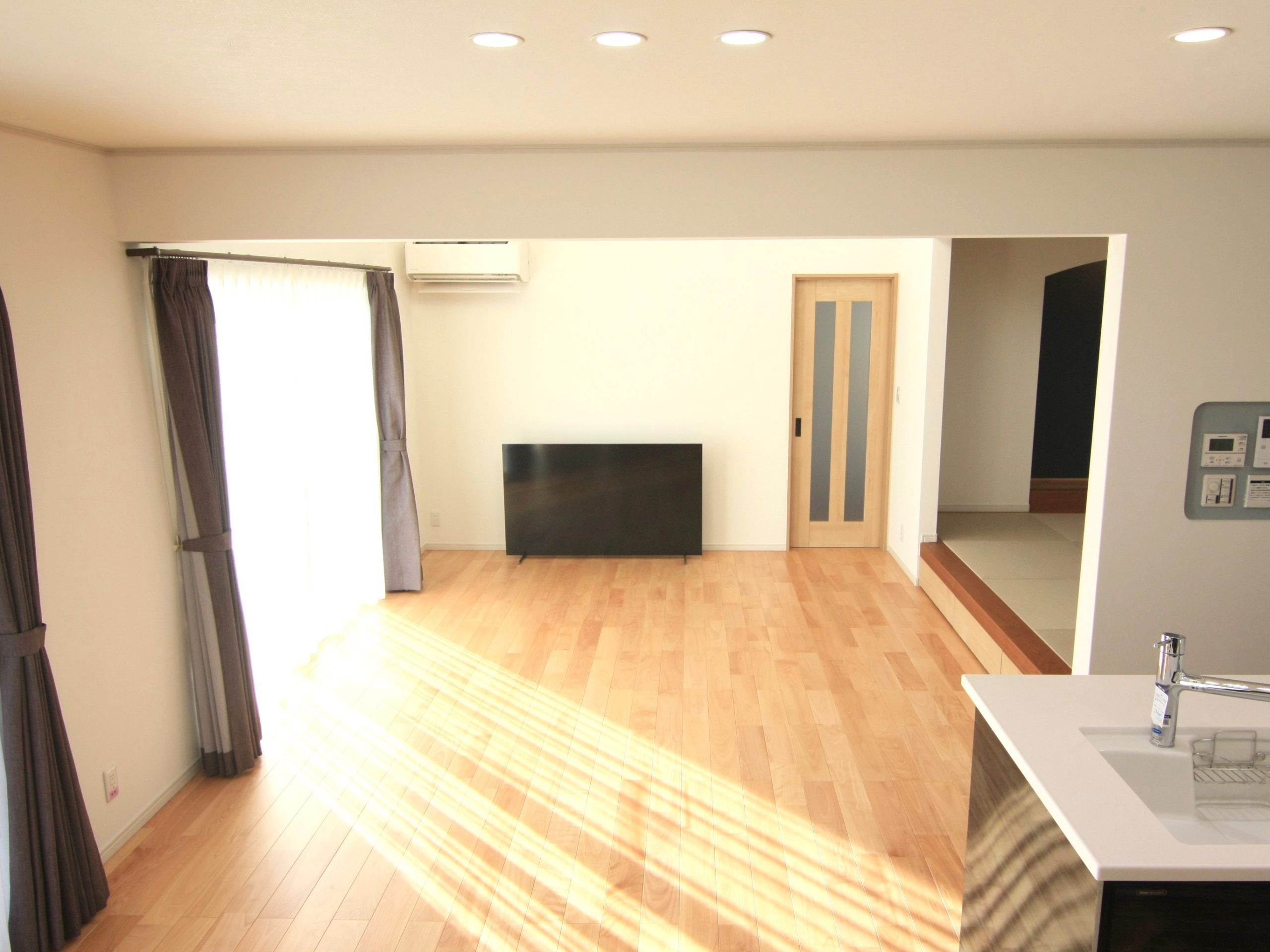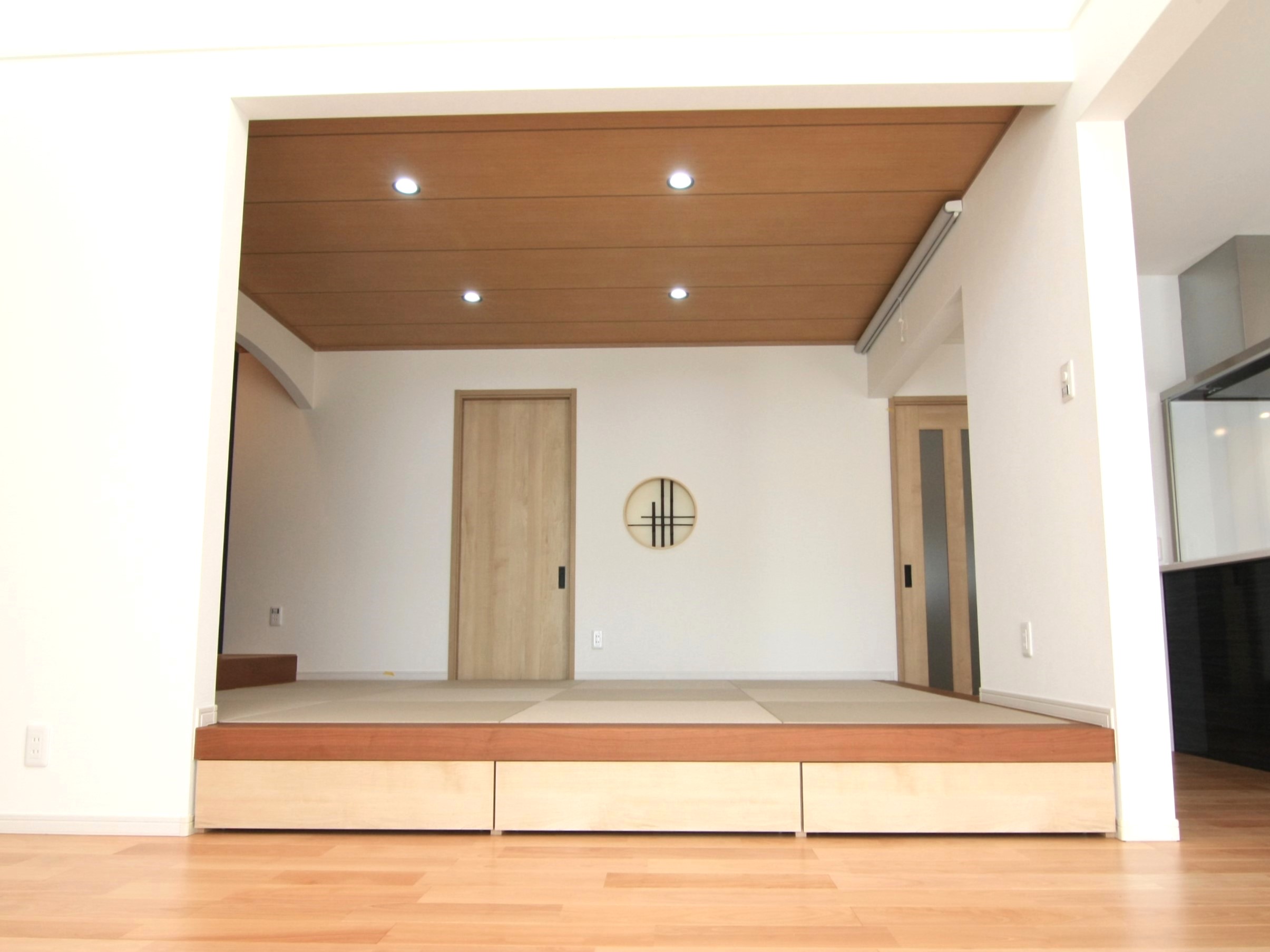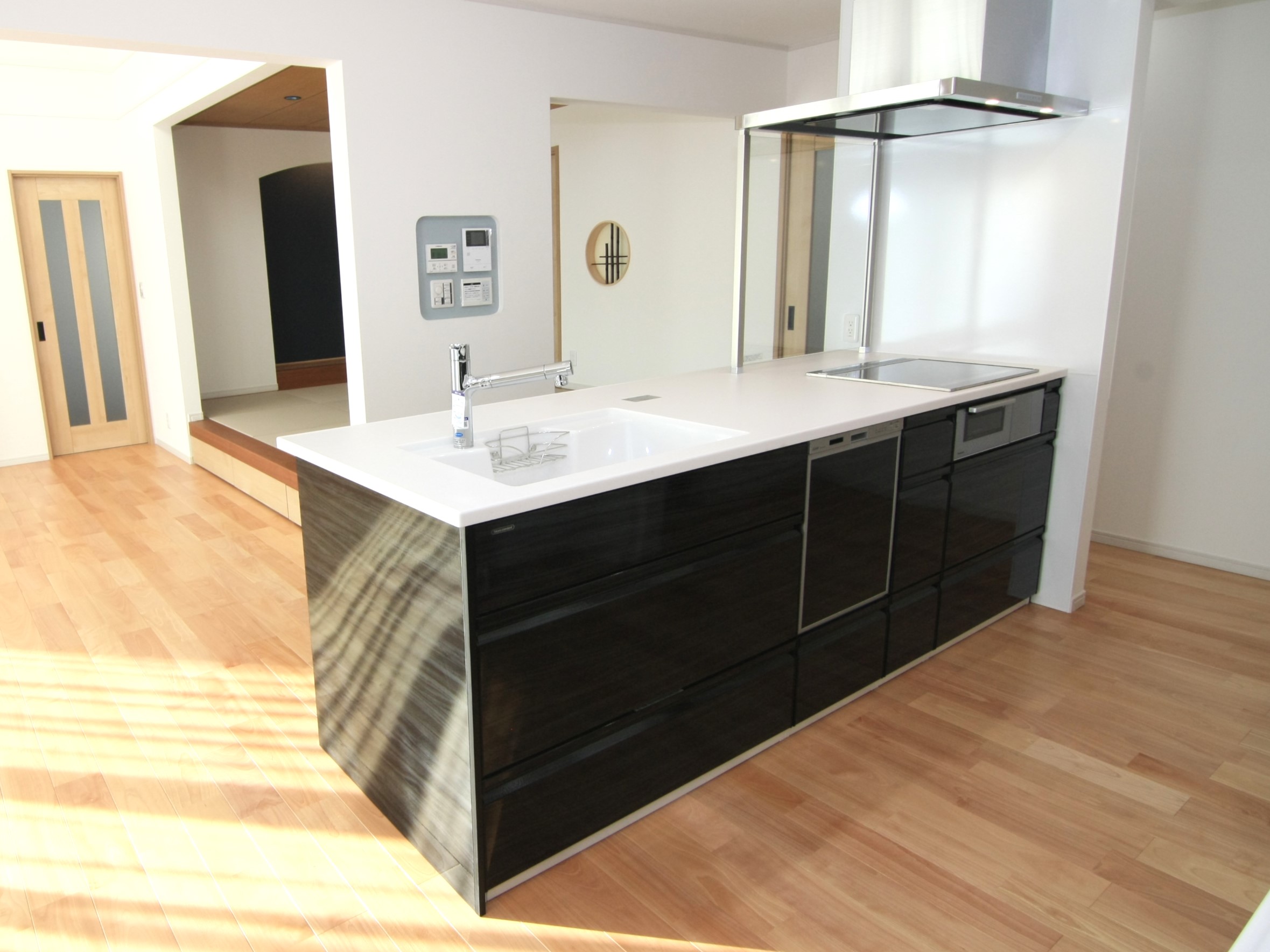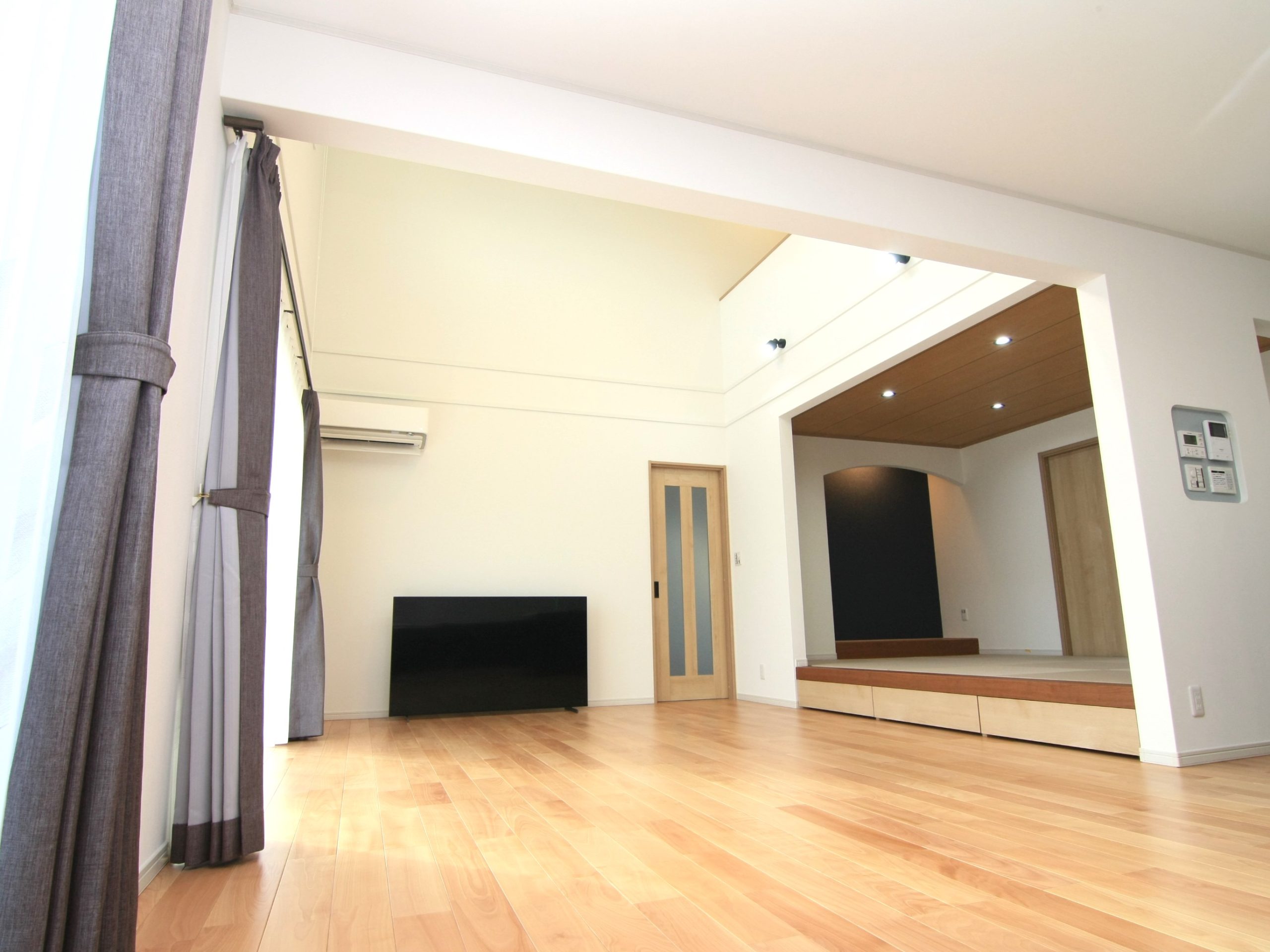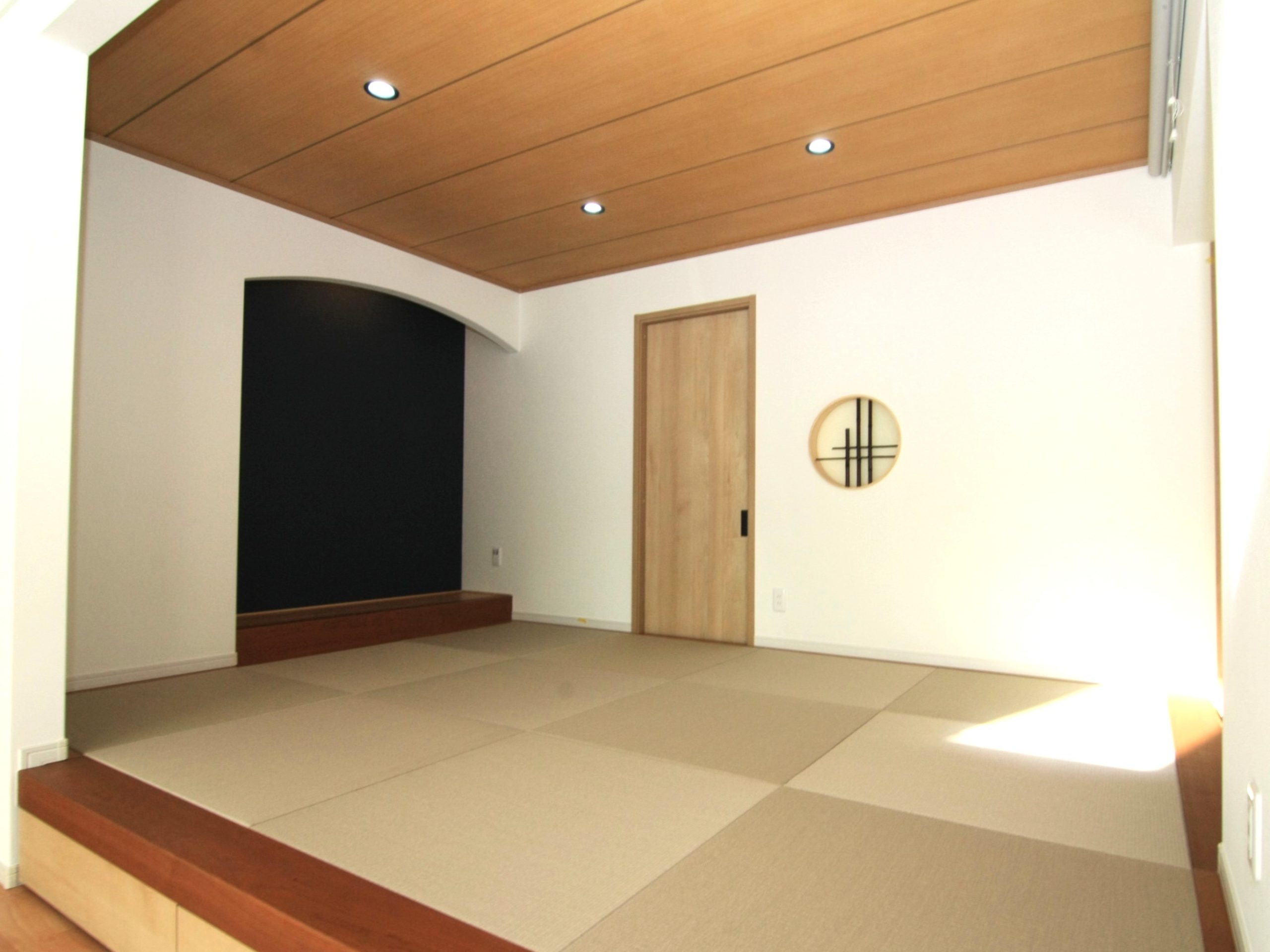 黒い外壁と縦格子デザインの玄関引き戸が重厚感を感じさせる和モダンの外観。22帖のLKDとそこに隣接する6帖の小上がりの和室、陽の光が射し込む8帖もある大きな吹抜けが開放感あふれる室内空間を演出。キッチン背面に設けたスキップフロアは、お子様のスタディスペースとしても活躍。シューズクロークからファミリークローゼット、ランドリールームと繋がる動線。和室の飾り丸窓やモダンな床の間、主寝室に採用したプロジェクタースクリーンなど、お施主様のこだわりをすべて詰め込んだ至高の住まいが完成しました。