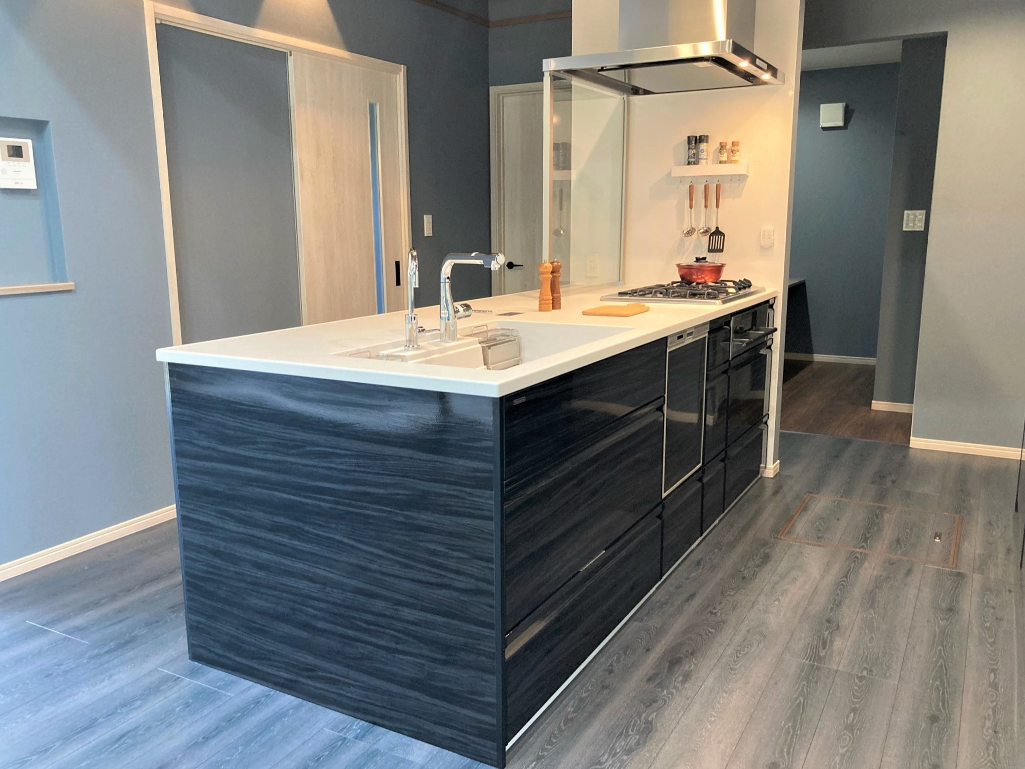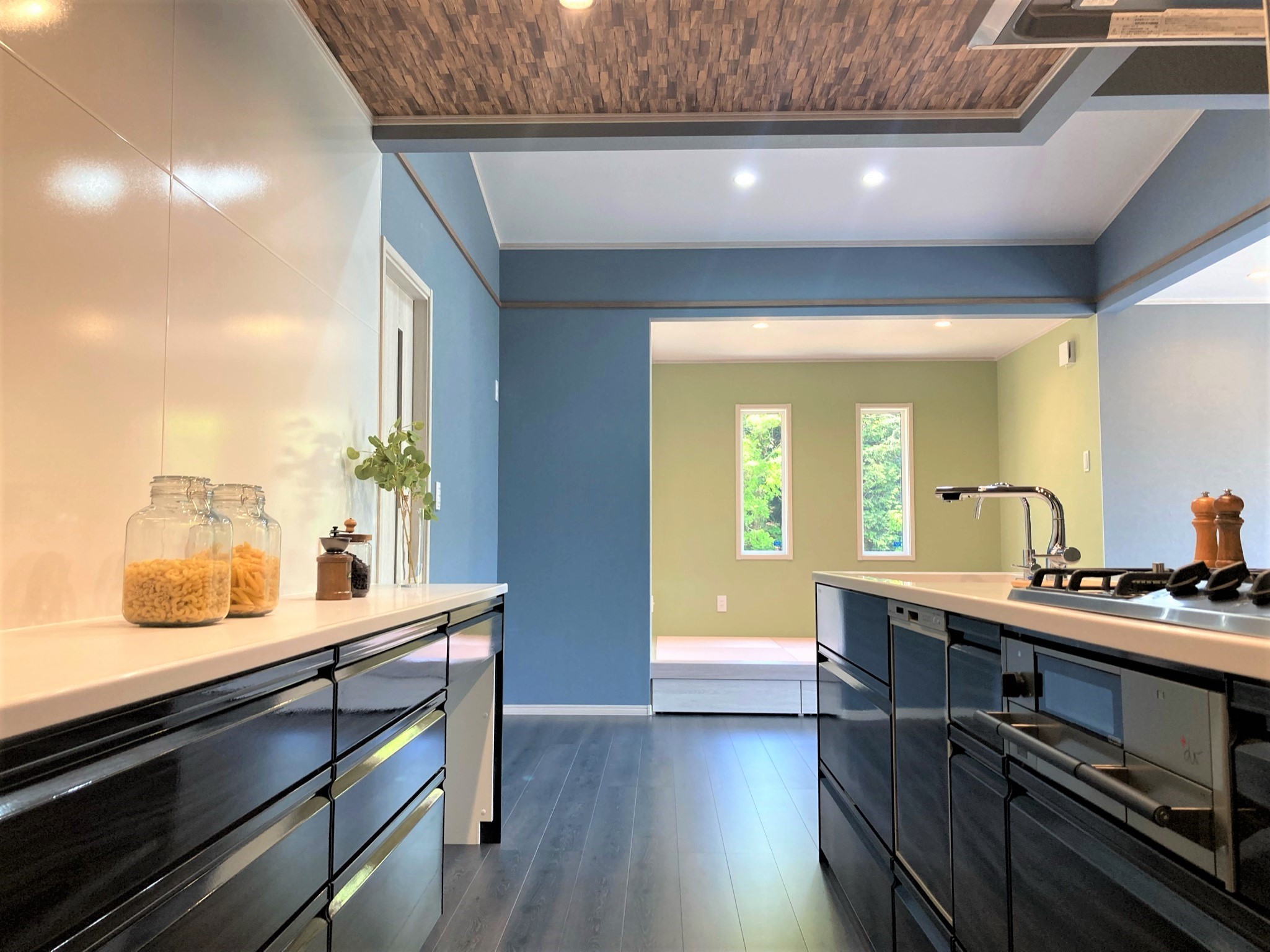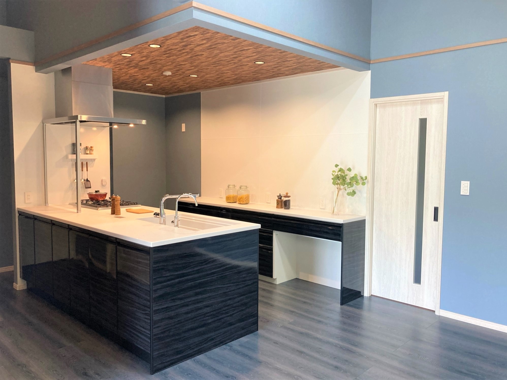 黒い外壁でシャープフォルムのスタイリッシュな外観デザイン。深いブルーのクロスに木目の天井やホワイトウッドの建具が美しく映える室内空間。趣味の自転車が収納できるシューズクロークや観賞用の水槽を置くカウンターのある広々とした玄関。アイランドキッチンを配置し、回遊動線を叶えたプランニング。LDKに隣接したワークスペースや洗面脱衣室と繋がるファミリークローゼット、フリースペースのロフト空間など、暮らしやすさを実現しながらデザイン性も優れた平屋の住まいが完成しました。
