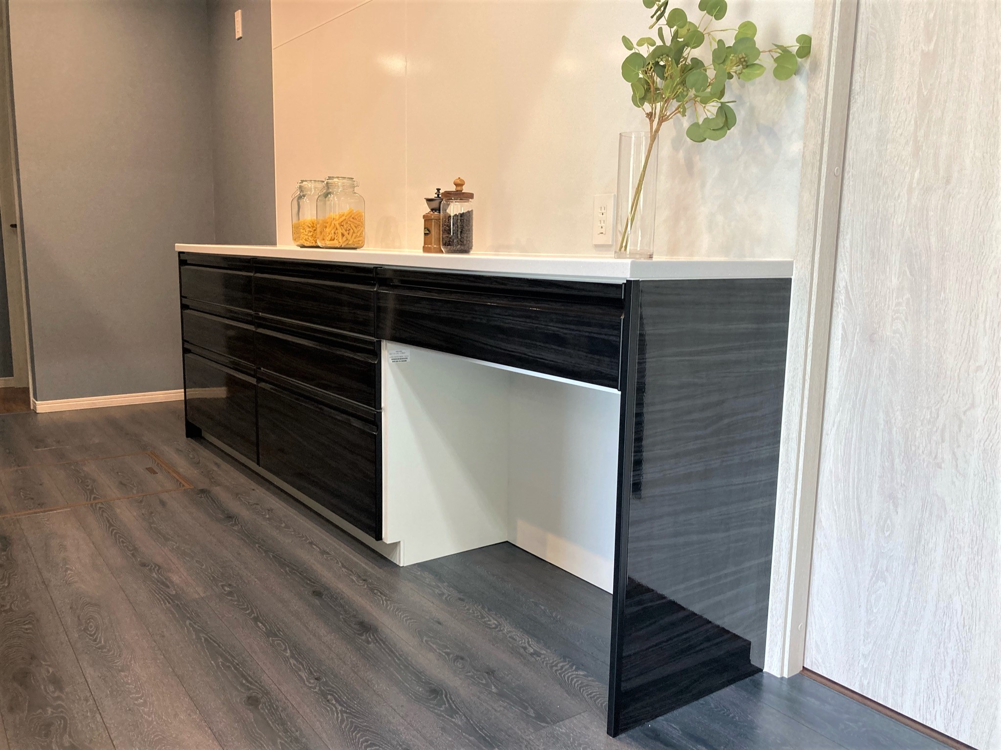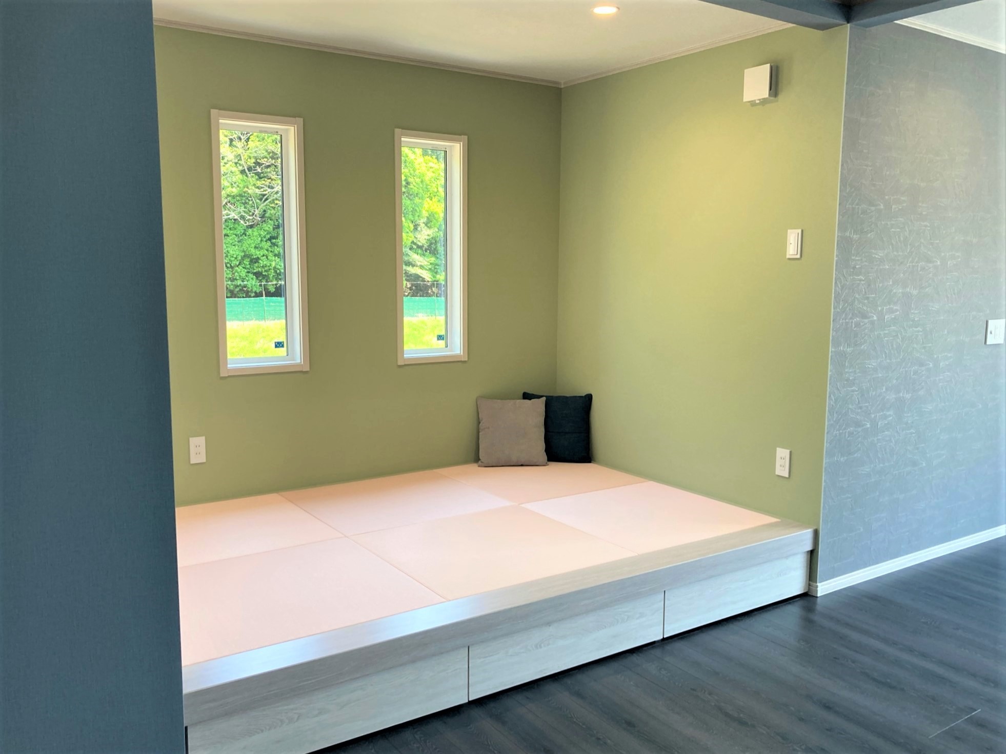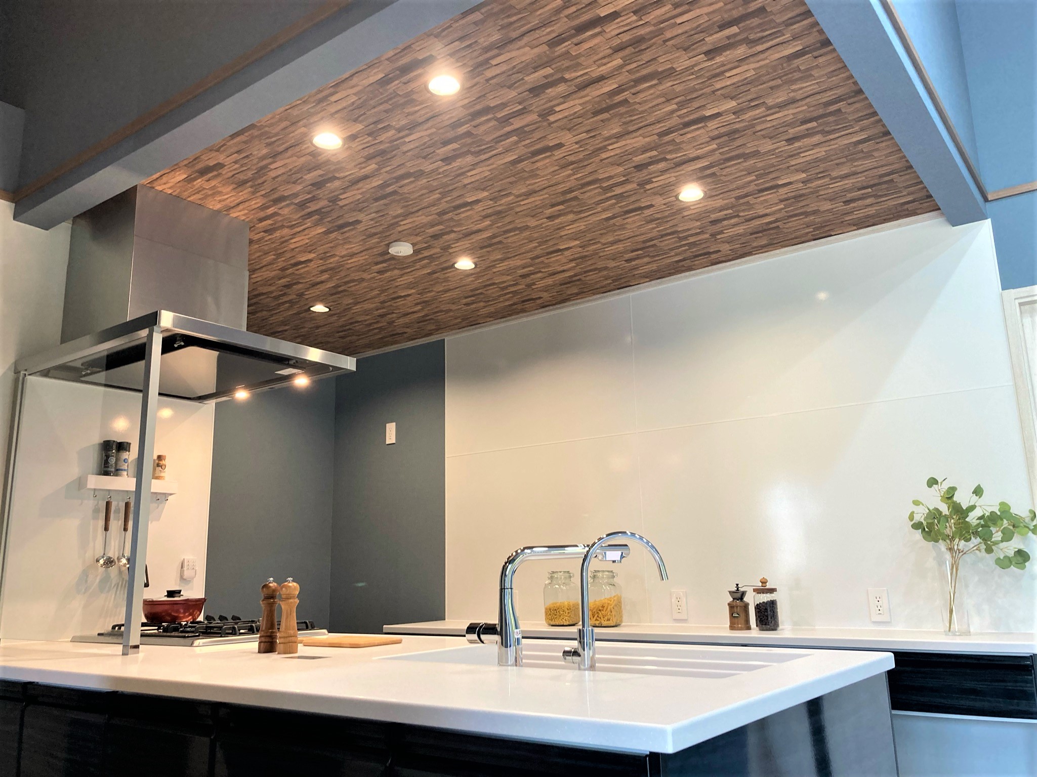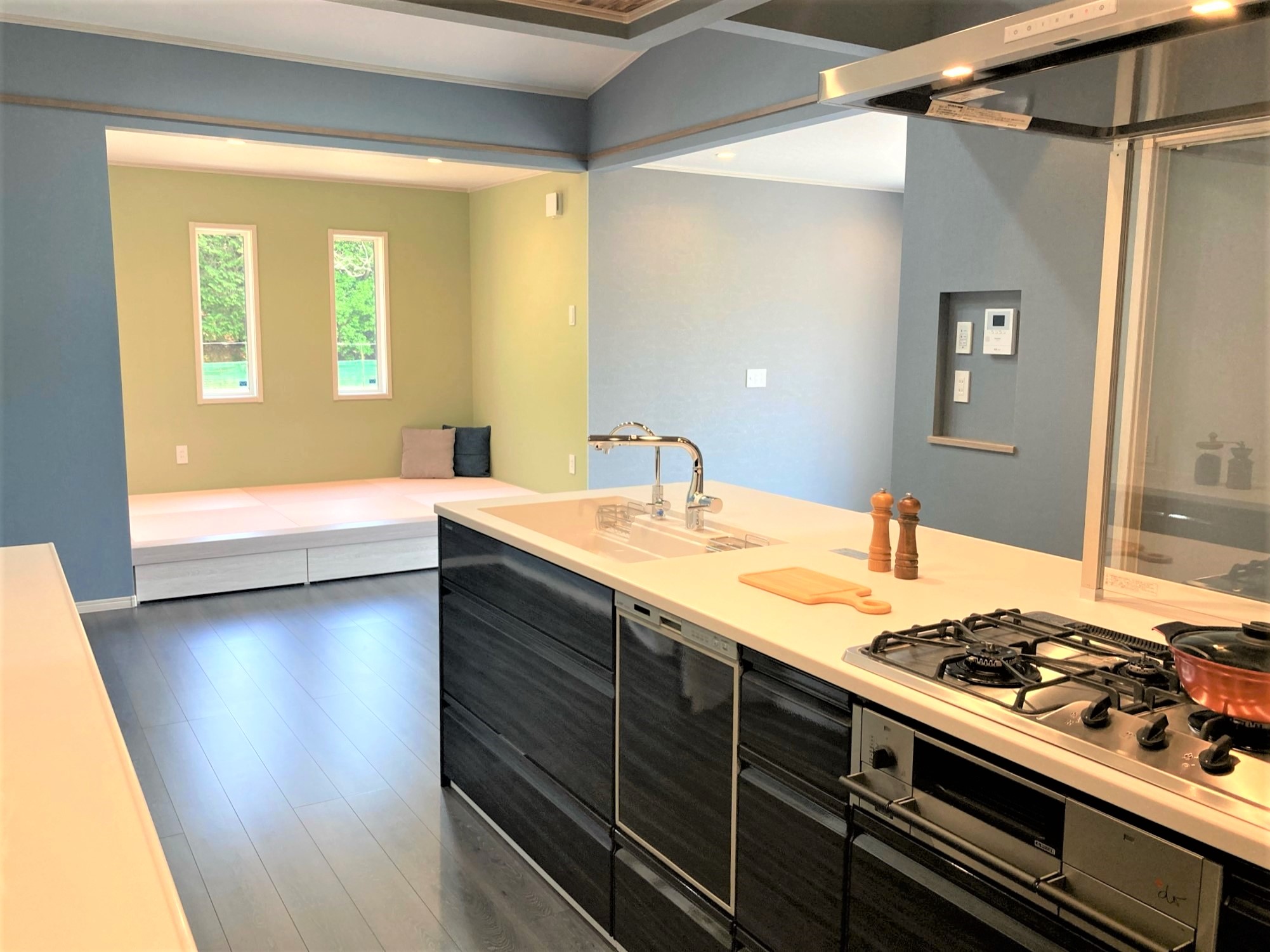 黒い外壁でシャープフォルムのスタイリッシュな外観デザイン。深いブルーのクロスに木目の天井やホワイトウッドの建具が美しく映える室内空間。趣味の自転車が収納できるシューズクロークや観賞用の水槽を置くカウンターのある広々とした玄関。アイランドキッチンを配置し、回遊動線を叶えたプランニング。LDKに隣接したワークスペースや洗面脱衣室と繋がるファミリークローゼット、フリースペースのロフト空間など、暮らしやすさを実現しながらデザイン性も優れた平屋の住まいが完成しました。