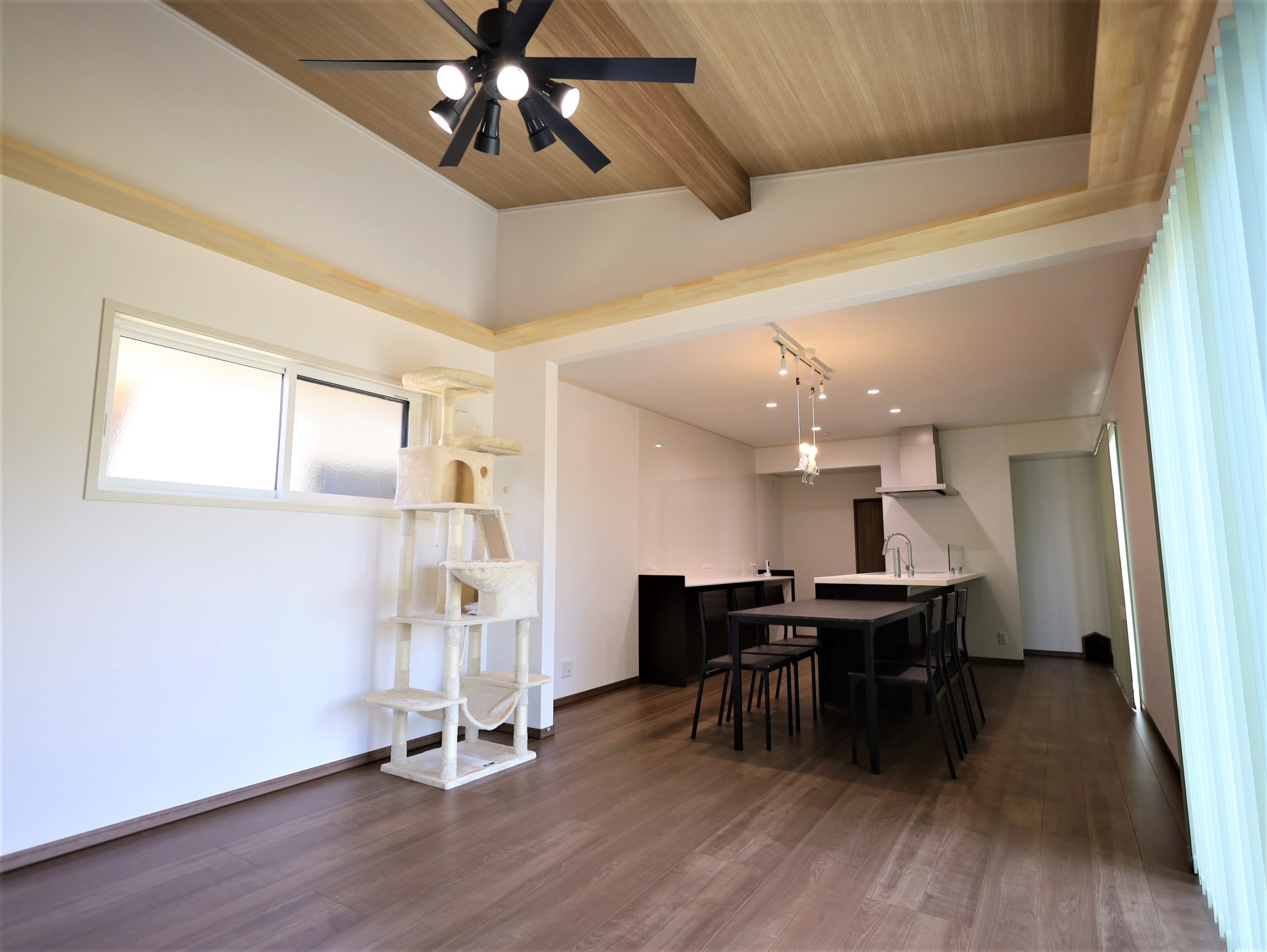 表情豊かな深いブラウンの細割のボーダー柄にライトブラウンの木目を合わせた、スタイリッシュな印象を与えるシンプルモダンな外観。家族みんながプライベートな時間を確保しながら団欒を楽しめる、20帖の広々としたLDKとそれぞれの個室を設けた間取り。室内干しも可能な収納を備えたランドリールームやホール洗面スペース、階段下を利用したパントリーなど、暮らしやすさを実現するアイデアが満載。リビングにキャットウォーク、1Fトイレにはペットゲートを設けるなど、愛猫と共に暮らす個性的なプランニングの住まいが完成しました。