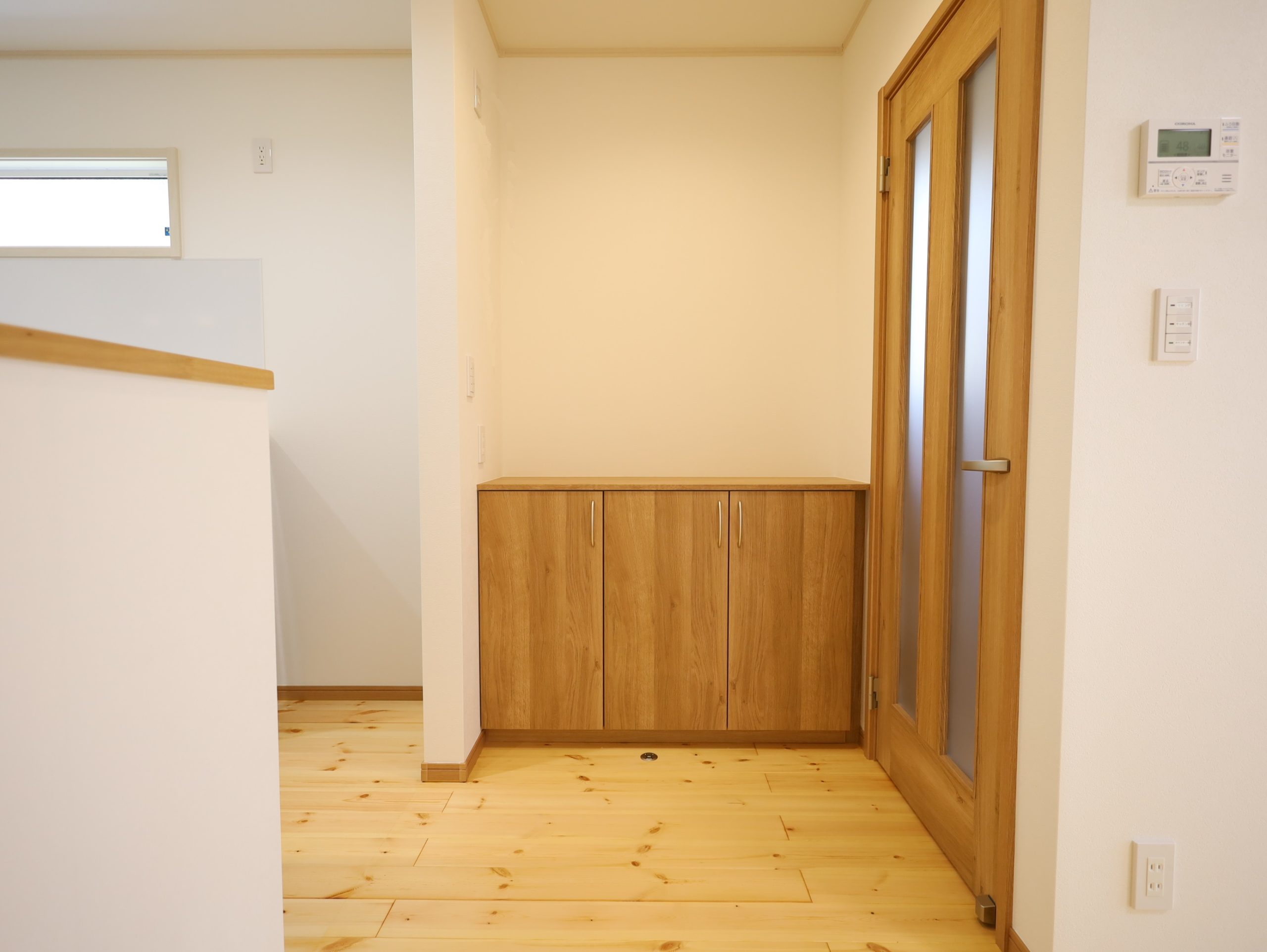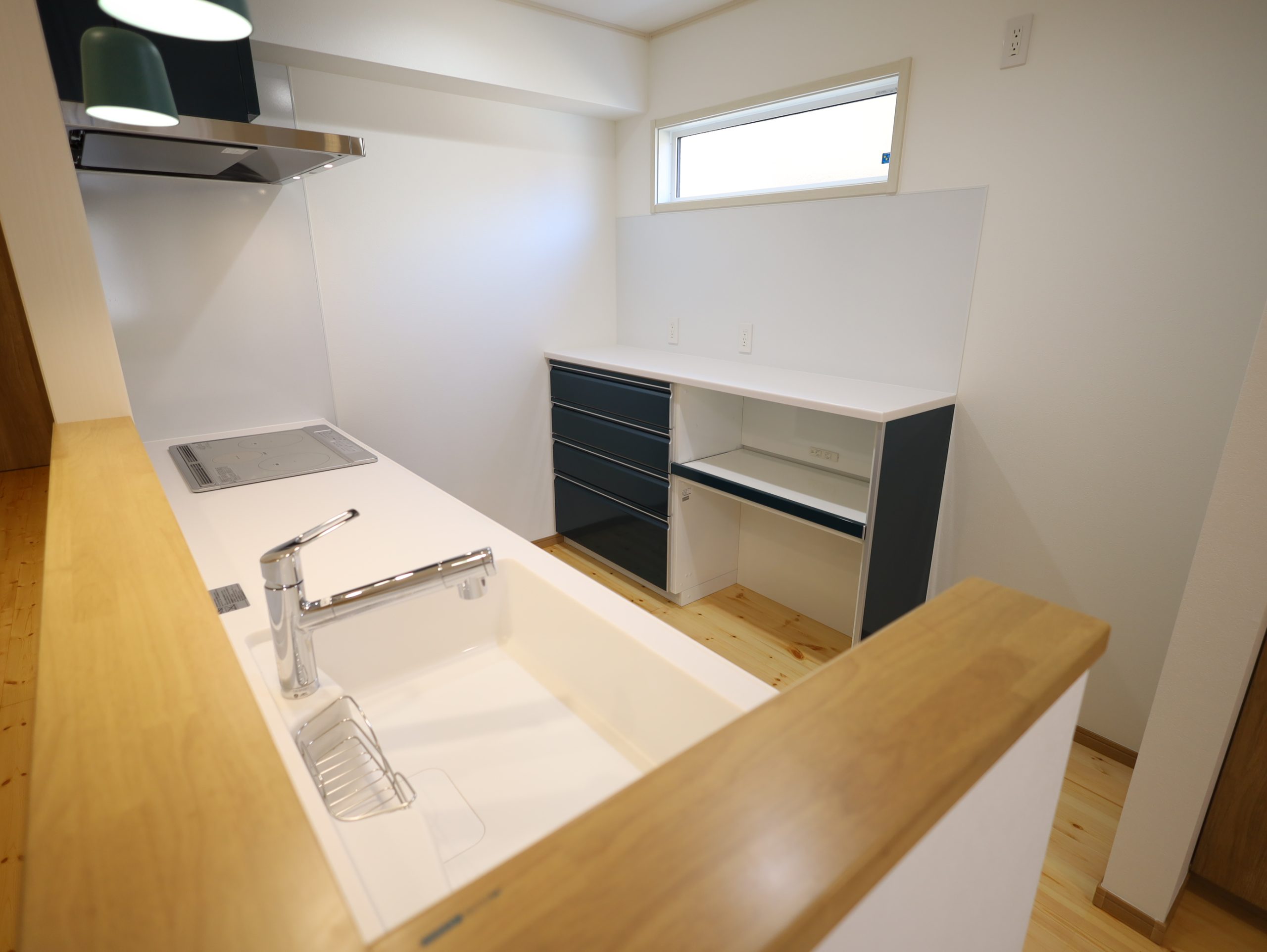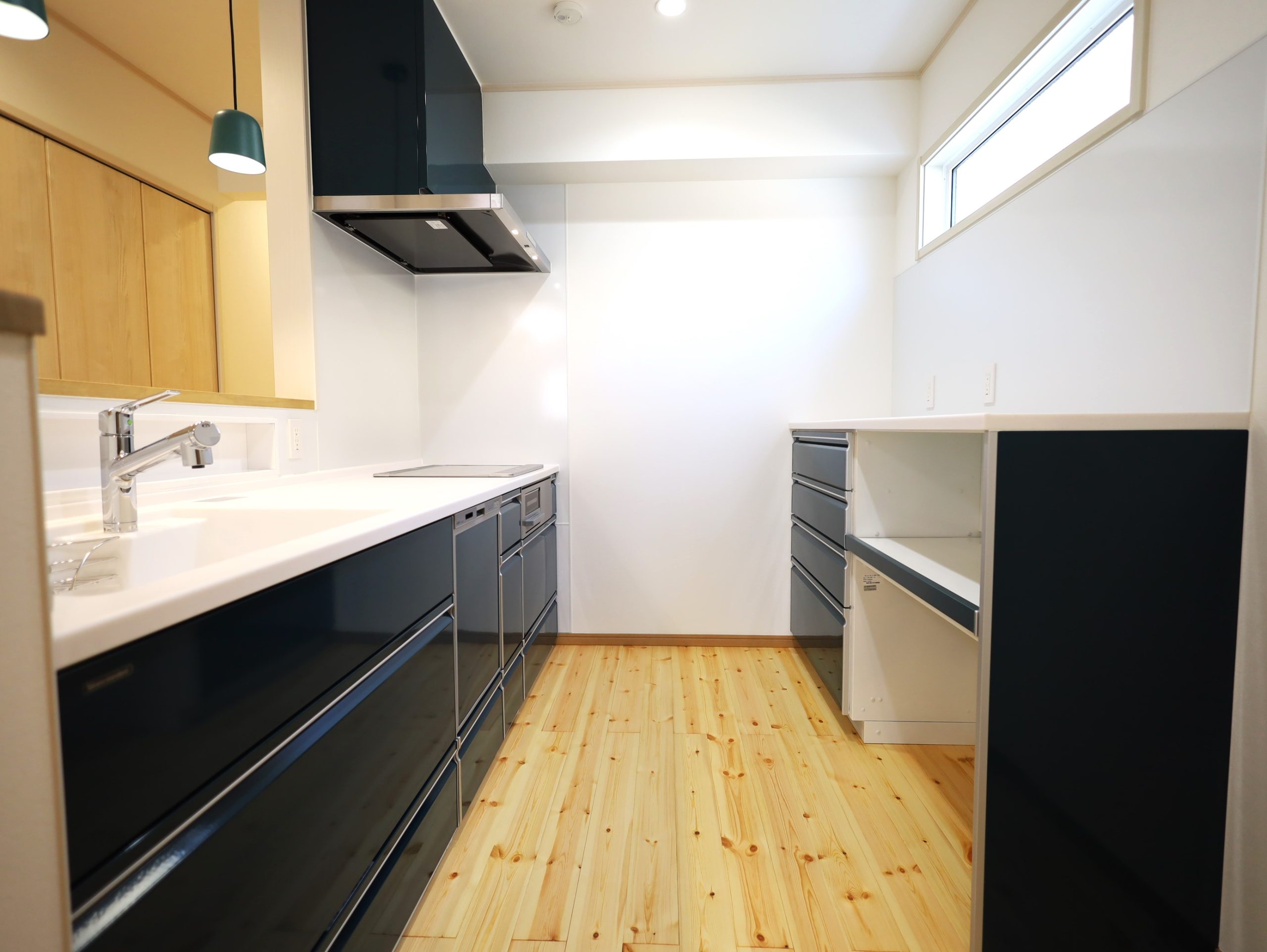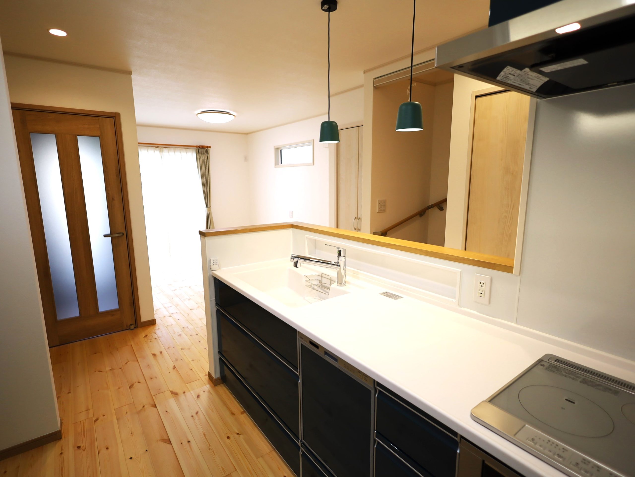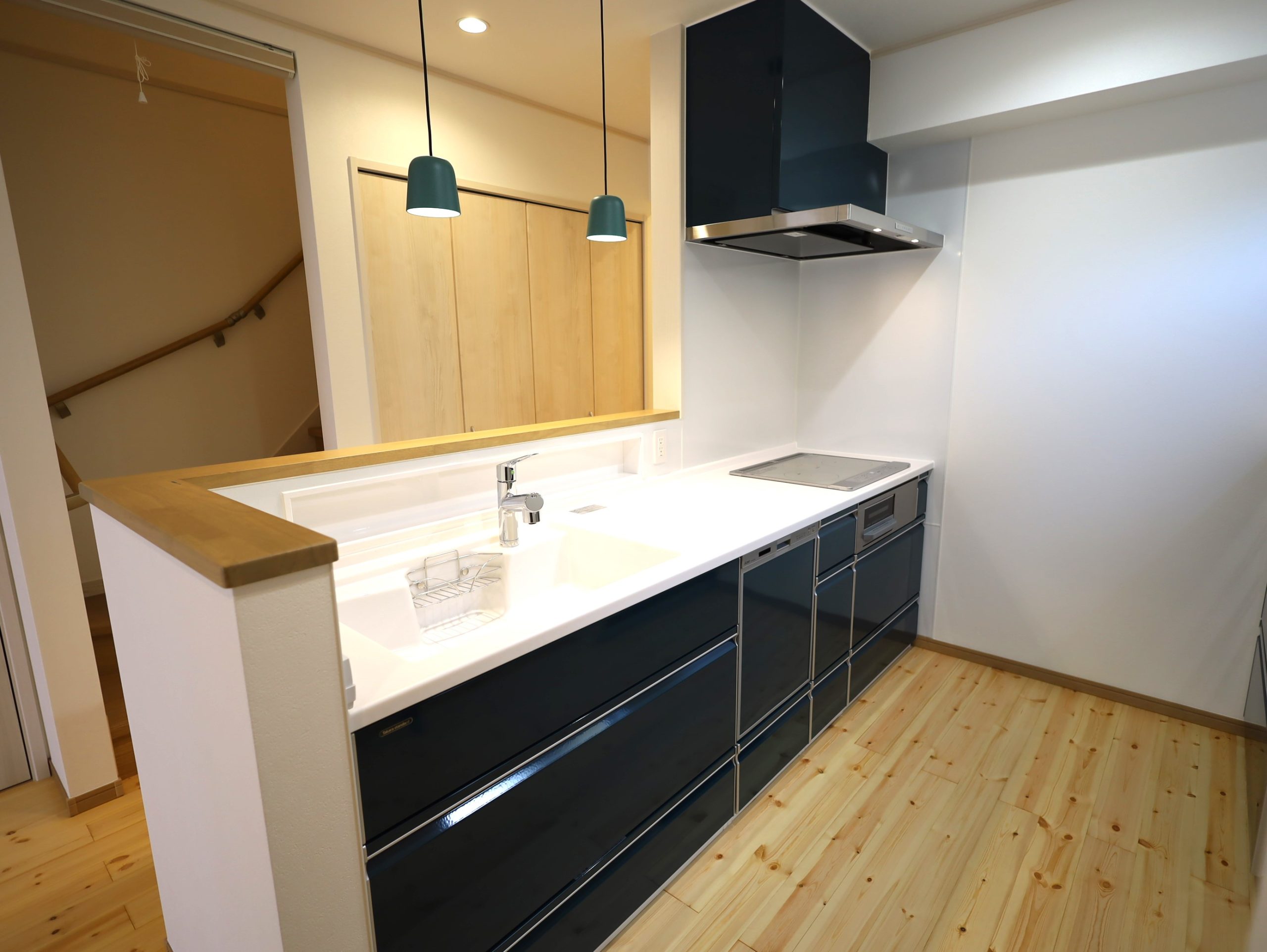 メインのネイビーにグレイッシュカラーの玄関ドアや木目調の外壁をアクセントにしたシンプルでお洒落な外観。パイン(松)の無垢フローリングを採用した1階フロアは、やさしく温かみのある室内。LDKと各居室から水廻りへの動線を工夫し、適材適所の収納を配置したことで暮らしやすさを実現。ホワイトを基調にした配色と各所に採光用の窓を設けることで、家全体が明るく広さを感じる快適な空間に。受け継がれてきた欅の一枚板の座卓をテーブルにリメイクしリビングダイニングで使うなど、想い出が詰まったまま建て替えで叶えられた家族が幸せに暮らす住まいが完成しました。