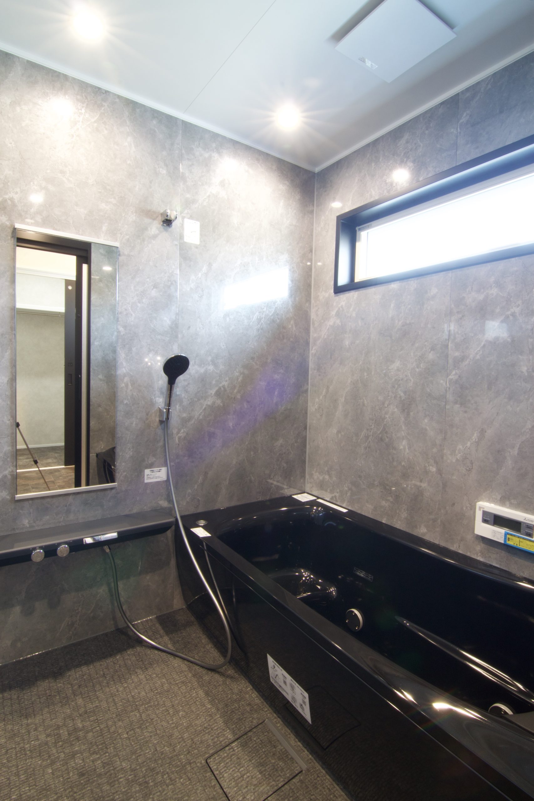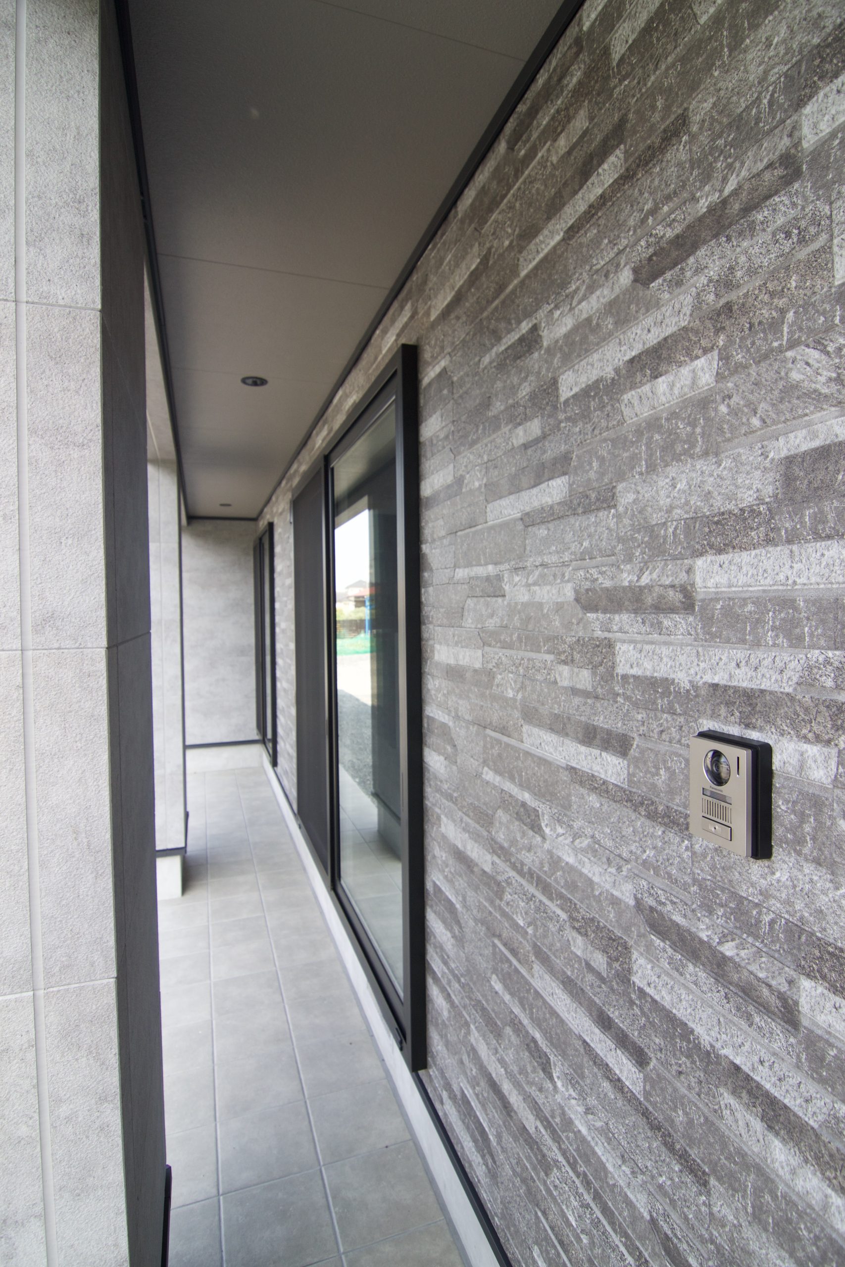 玄関周りのアクセントが映えるグレーの外観。落ち着いた配色でお客様をお迎えします。