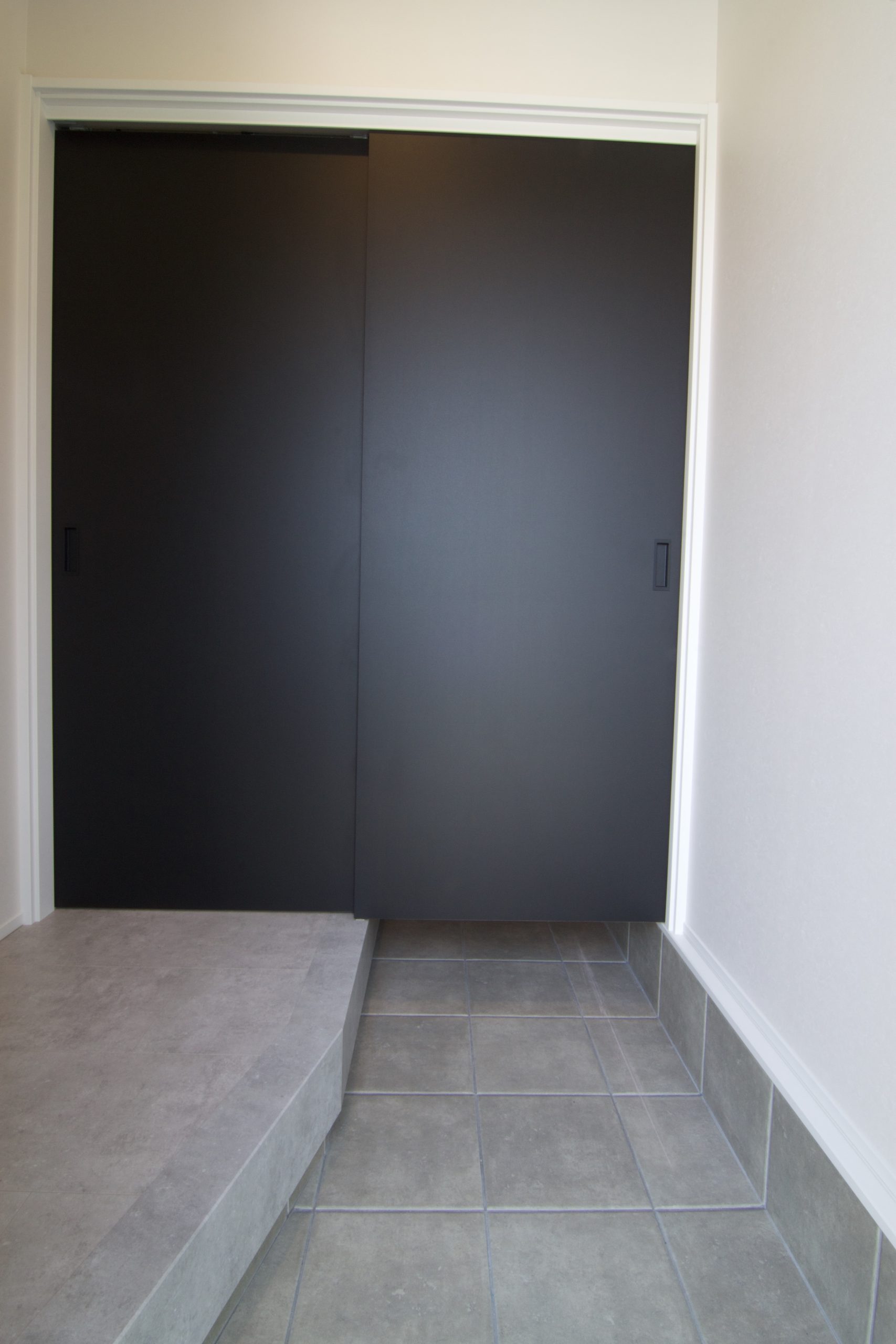 大容量のシューズクローゼットは黒の引き違い戸により周囲のグレーを更に引き立てます