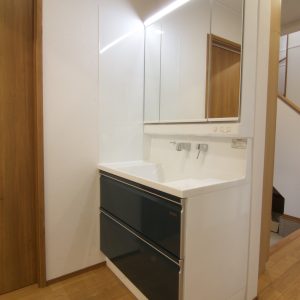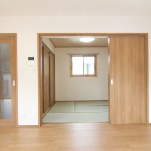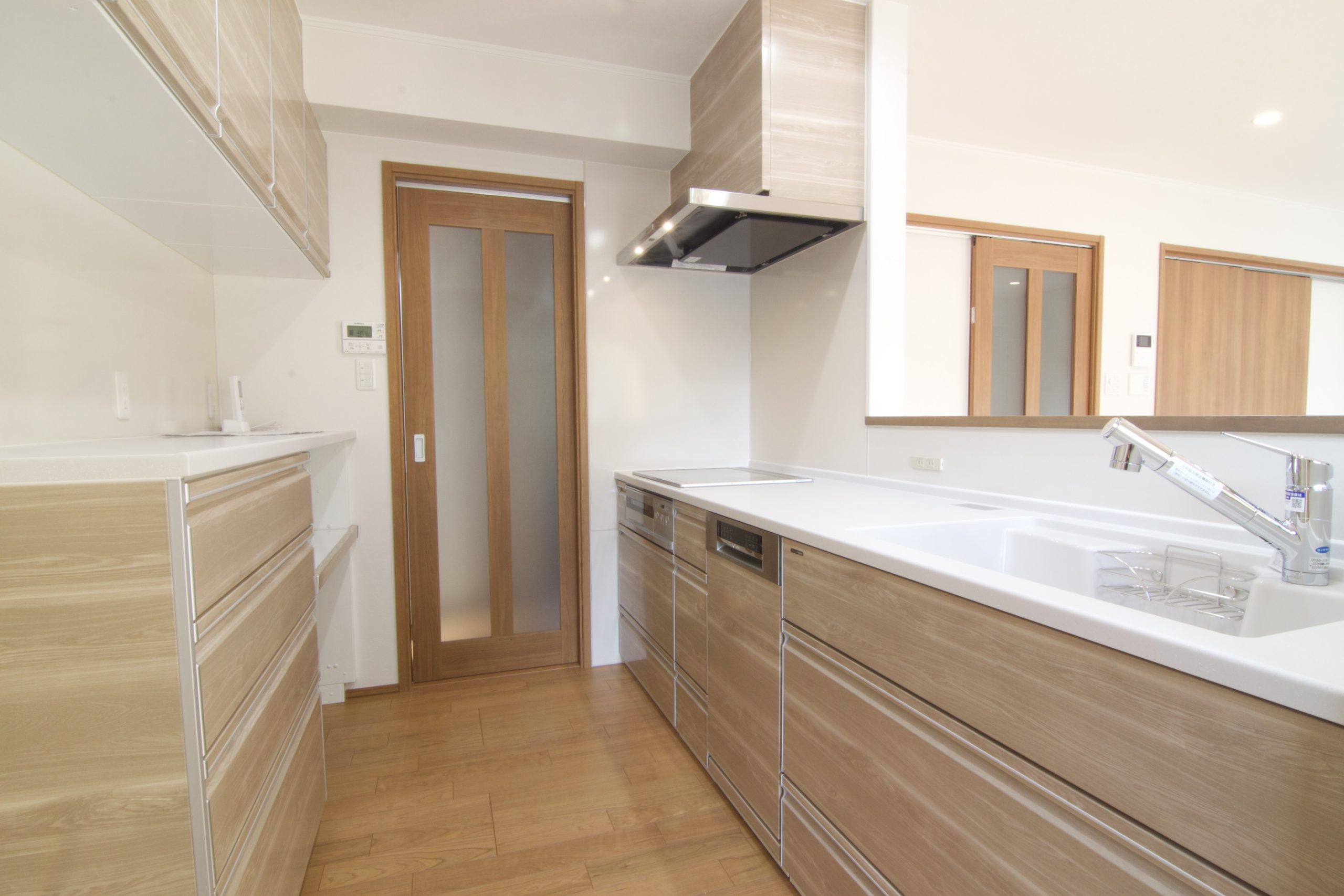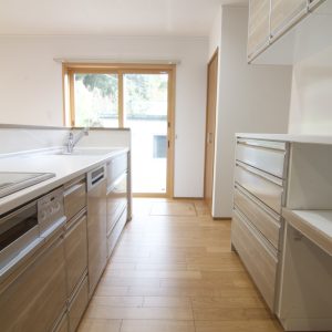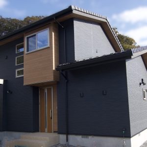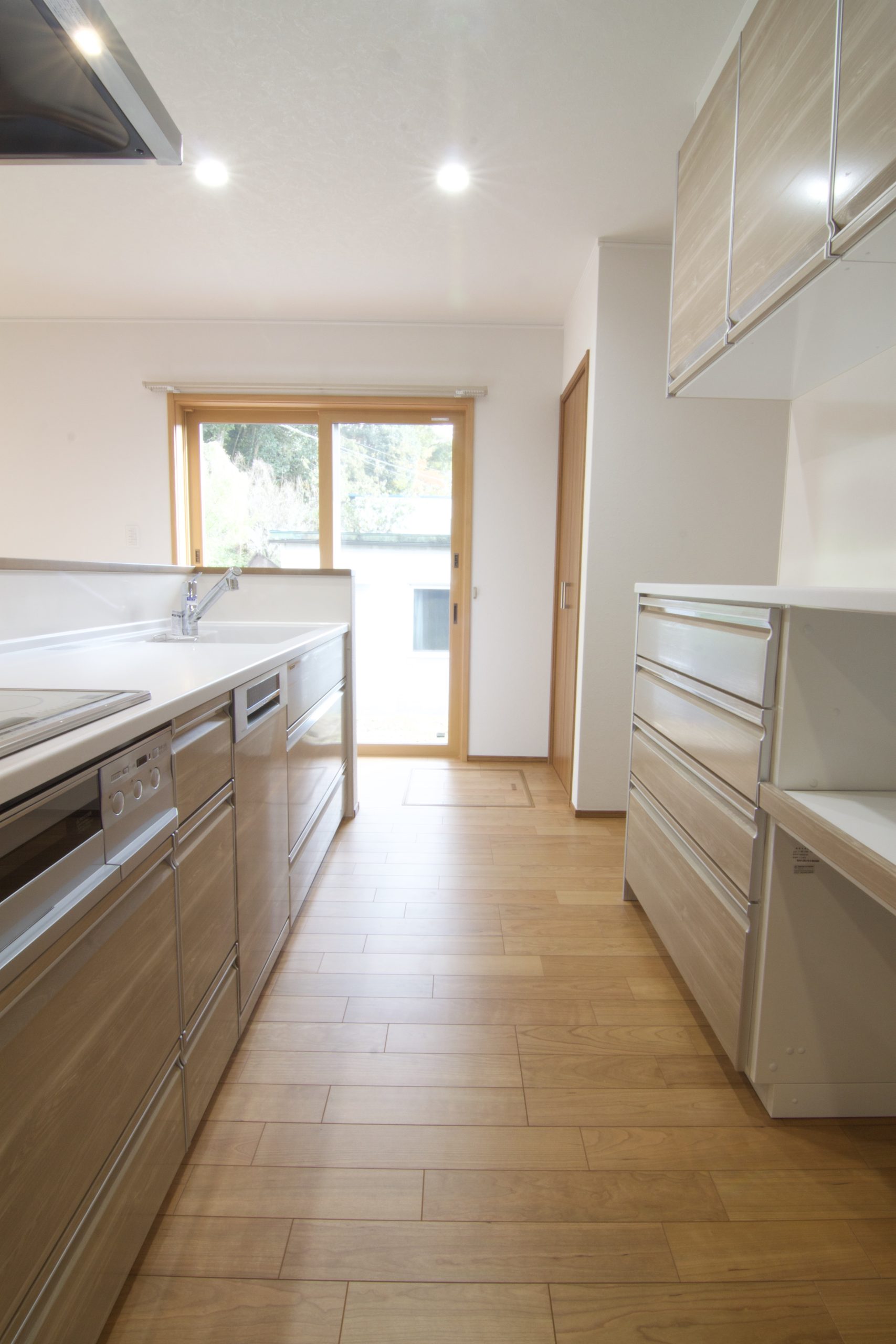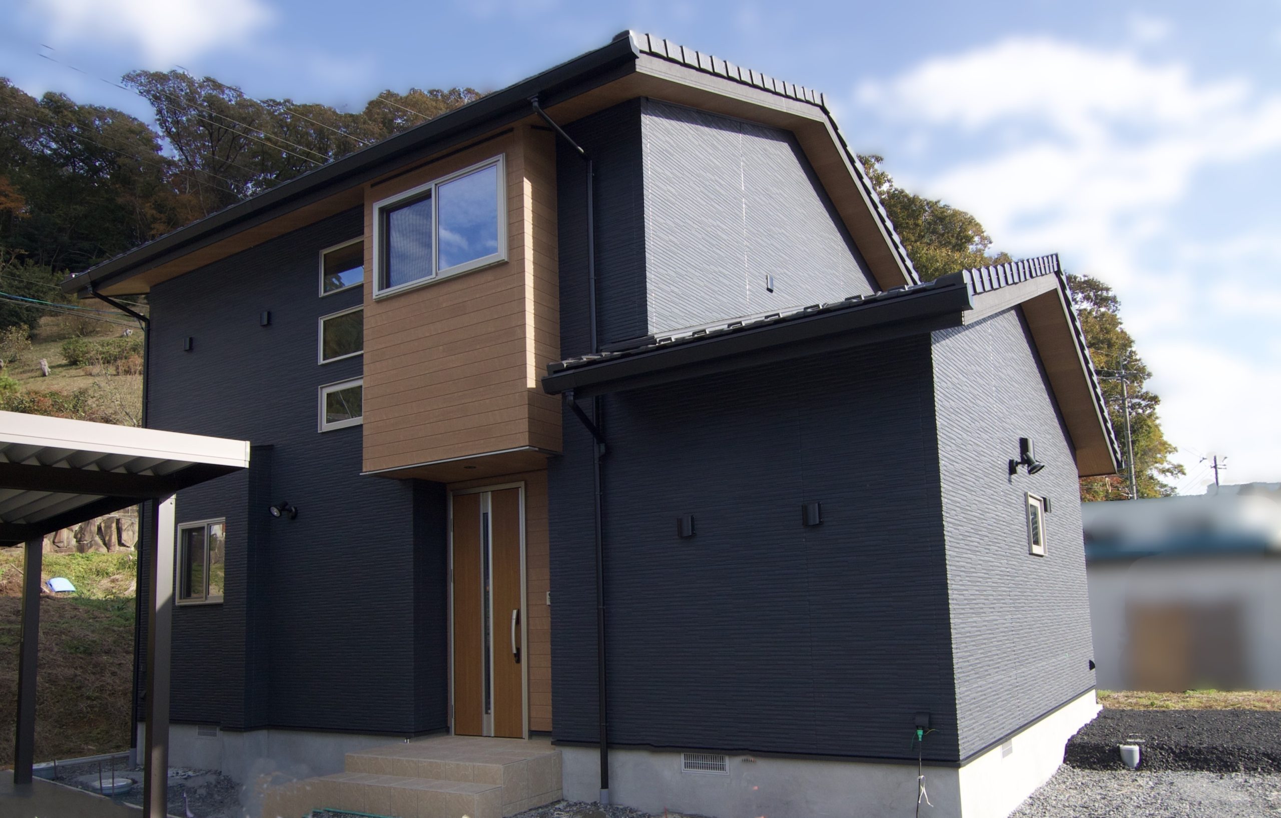 ネイビーにウッド調のサイディングが調和する上品な外観。室内は白を基調に建具もナチュラルな優しいコーディネートに統一。明るいLDKには4.5帖の和室も繋がりゆったりとくつろいでいただけます。キッチンには立ち上がり壁を付けてダイニング側にニッチを作りました。冷蔵庫の「出っ張り」も気にならないように設計し冷蔵庫と収納棚が一列に揃うように設置できます。収納量あるクローゼットを1階にも2階にも作りました。スッキリとして効率良く家事ができる、家族にゆとりが生まれるそんな素敵なお住まいの完成です。