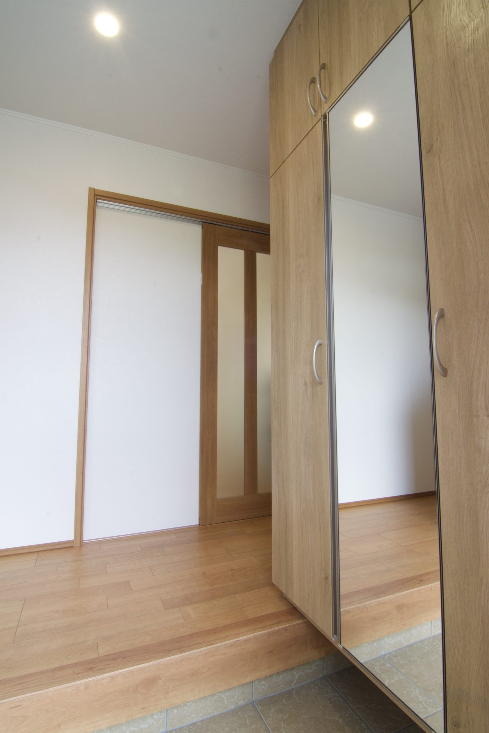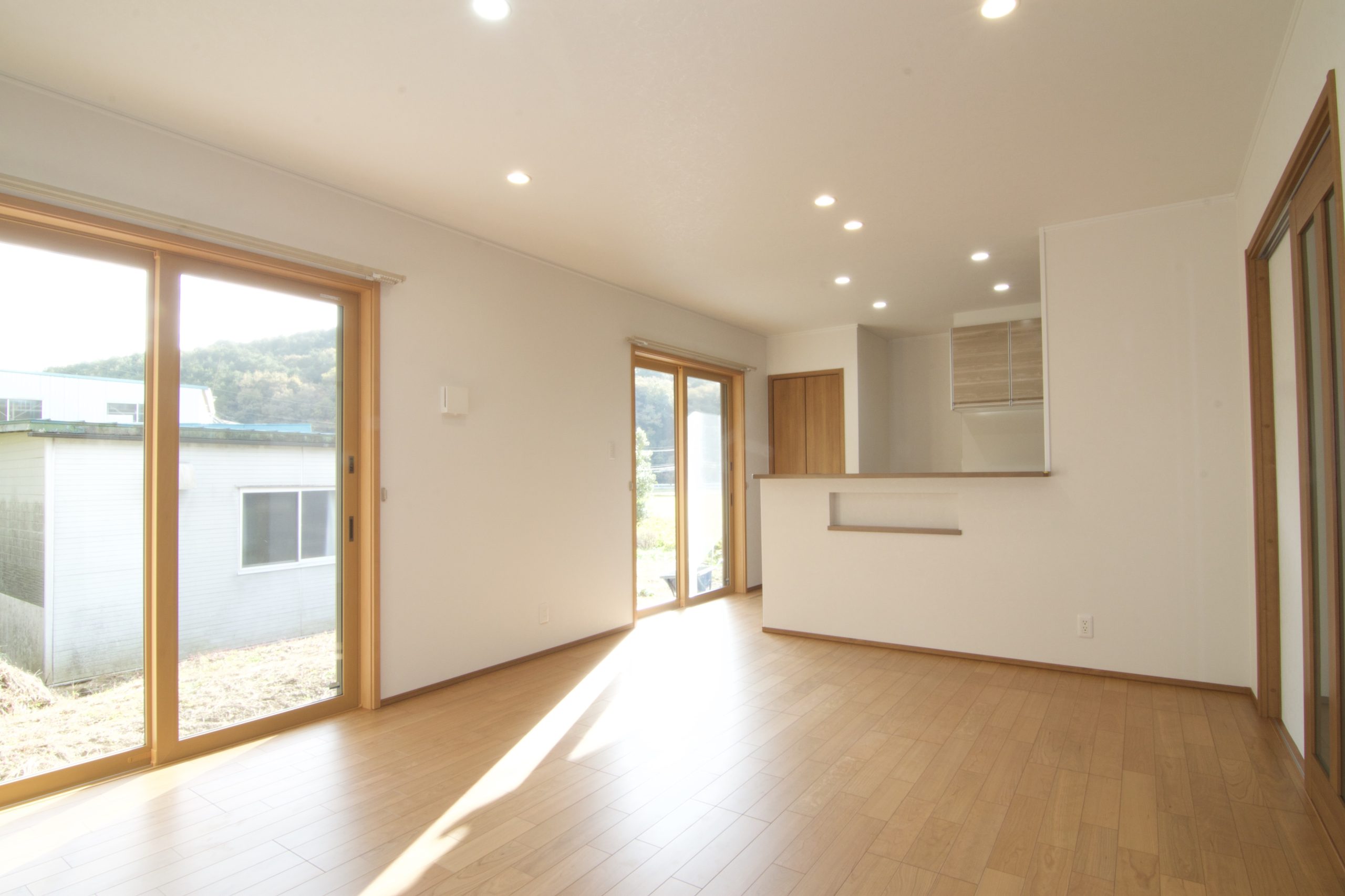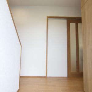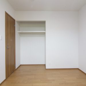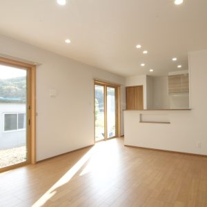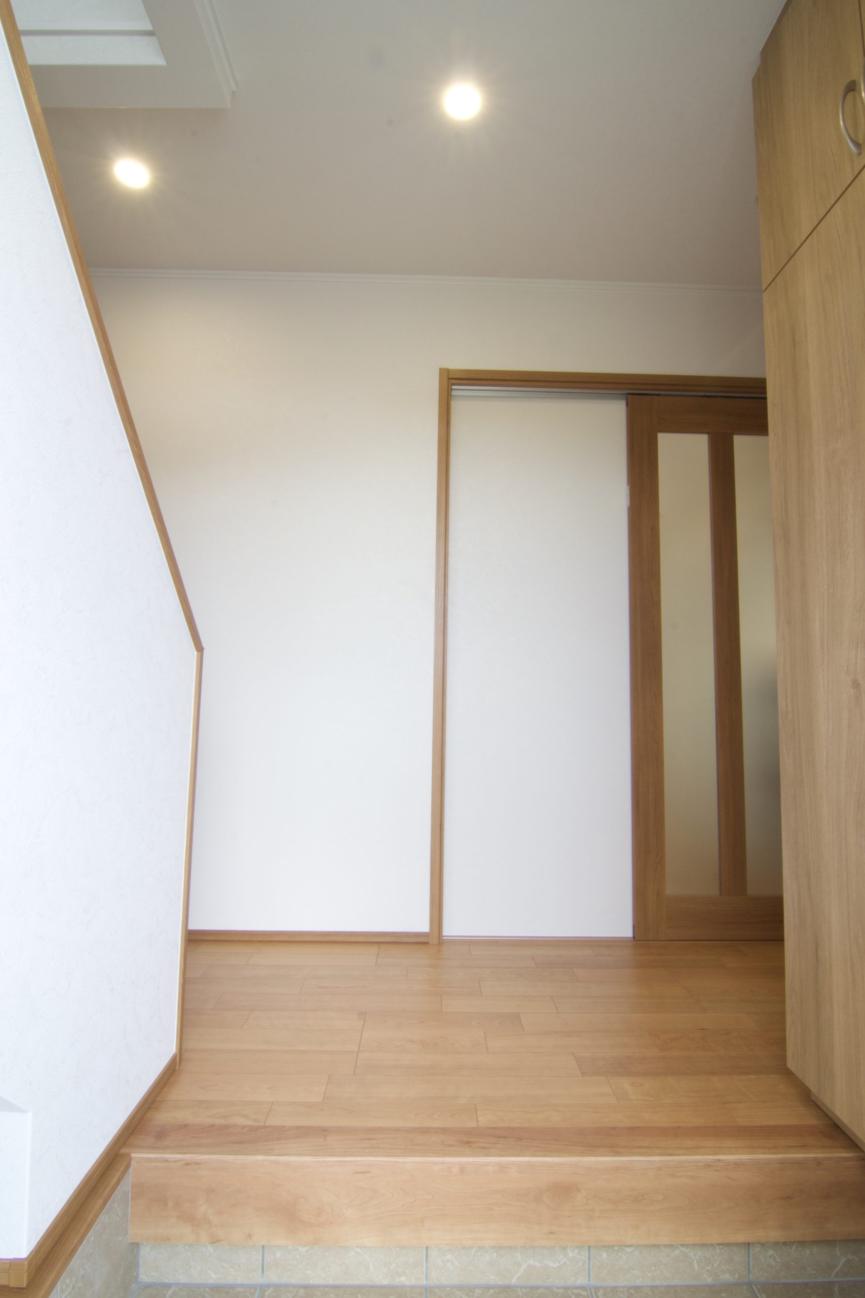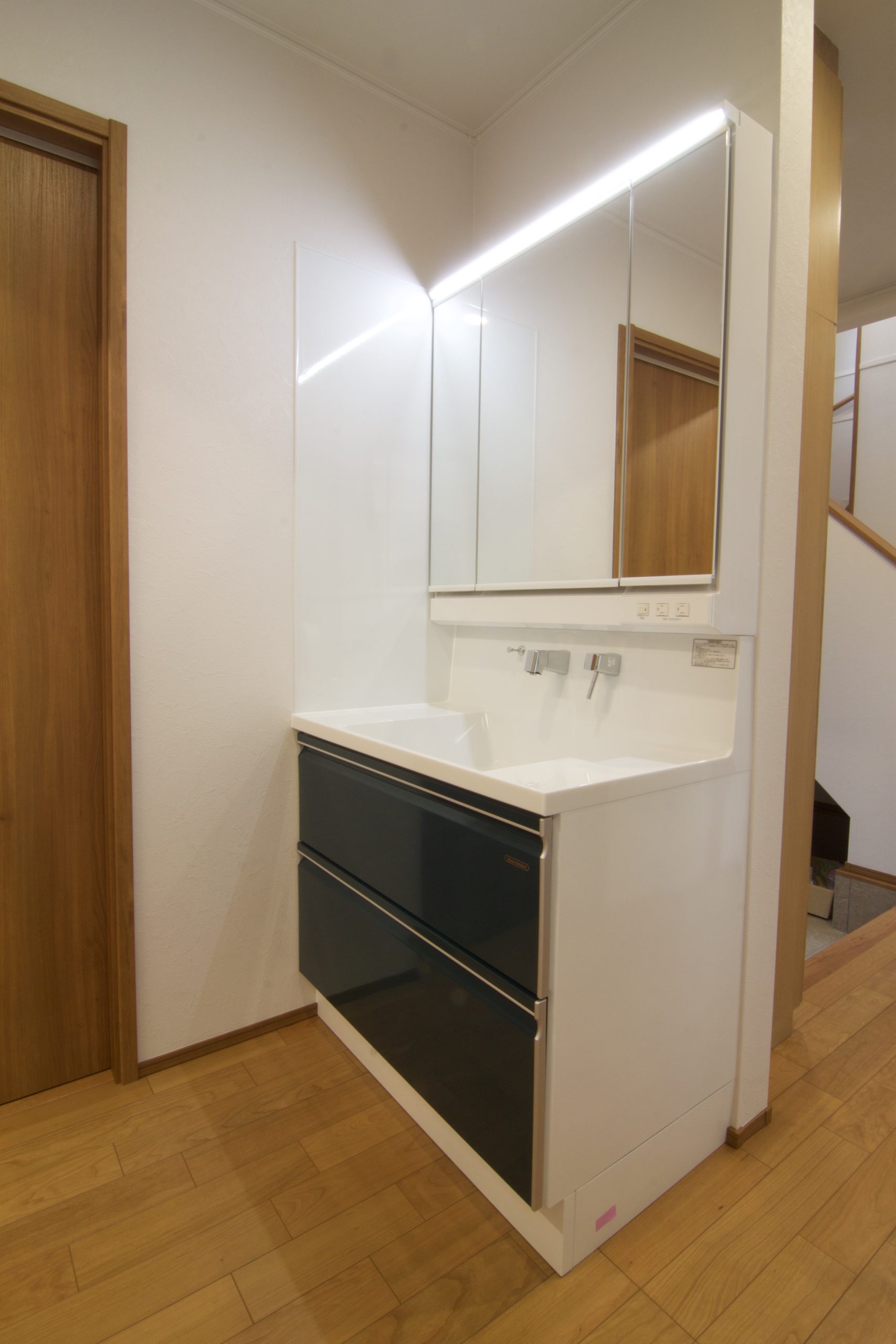 ネイビーにウッド調のサイディングが調和する上品な外観。室内は白を基調に建具もナチュラルな優しいコーディネートに統一。明るいLDKには4.5帖の和室も繋がりゆったりとくつろいでいただけます。キッチンには立ち上がり壁を付けてダイニング側にニッチを作りました。冷蔵庫の「出っ張り」も気にならないように設計し冷蔵庫と収納棚が一列に揃うように設置できます。収納量あるクローゼットを1階にも2階にも作りました。スッキリとして効率良く家事ができる、家族にゆとりが生まれるそんな素敵なお住まいの完成です。